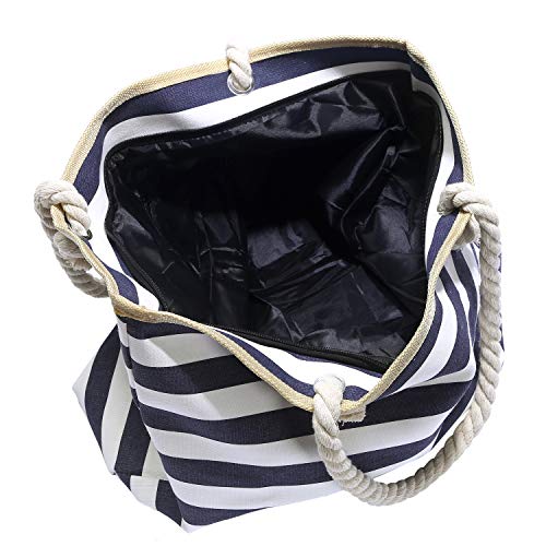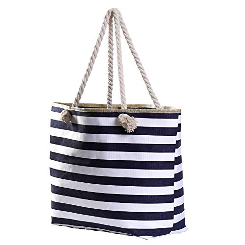Specification: Grote waterafstotende strandtas met rits 58 x 38 x 18 cm gestreept donkerblauw wit shopper schoudertas