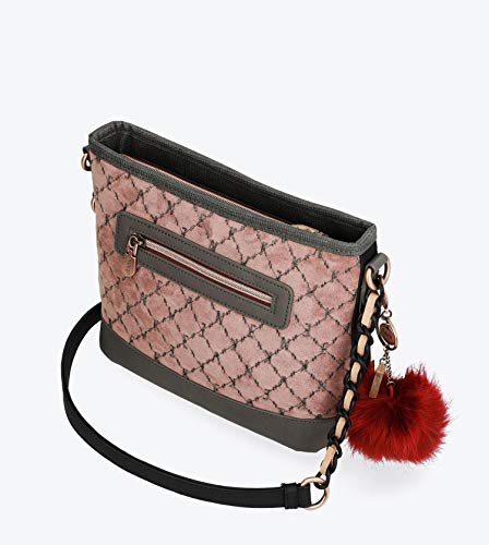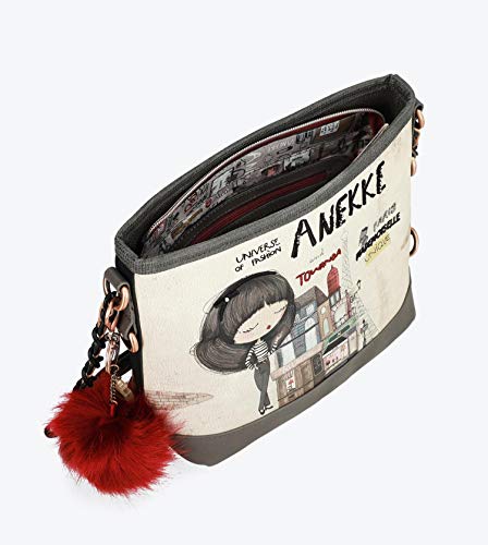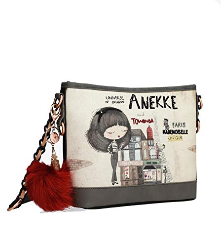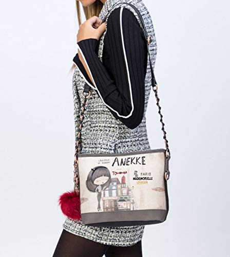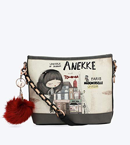 Een modieus universum opent met deze originele schoudertas in grijs! Laat je verliefd worden door Anekke Couture en vergeet nooit uit huis met deze prachtige schoudertas. De voorzijde is de afbeelding van de collectie en de achterkant is van roze bekleed fluweel. Hij beschikt over talloze details, zoals borduurwerk, decoratieve opdruk, voering bedrukt en sleutelhanger met pompon. Het handvat om op te hangen is gemaakt van zwarte schakels en met beigekleurig kunstleer. Het is elegant, zeer combineerbaar, en je zult er liefde van zijn.
